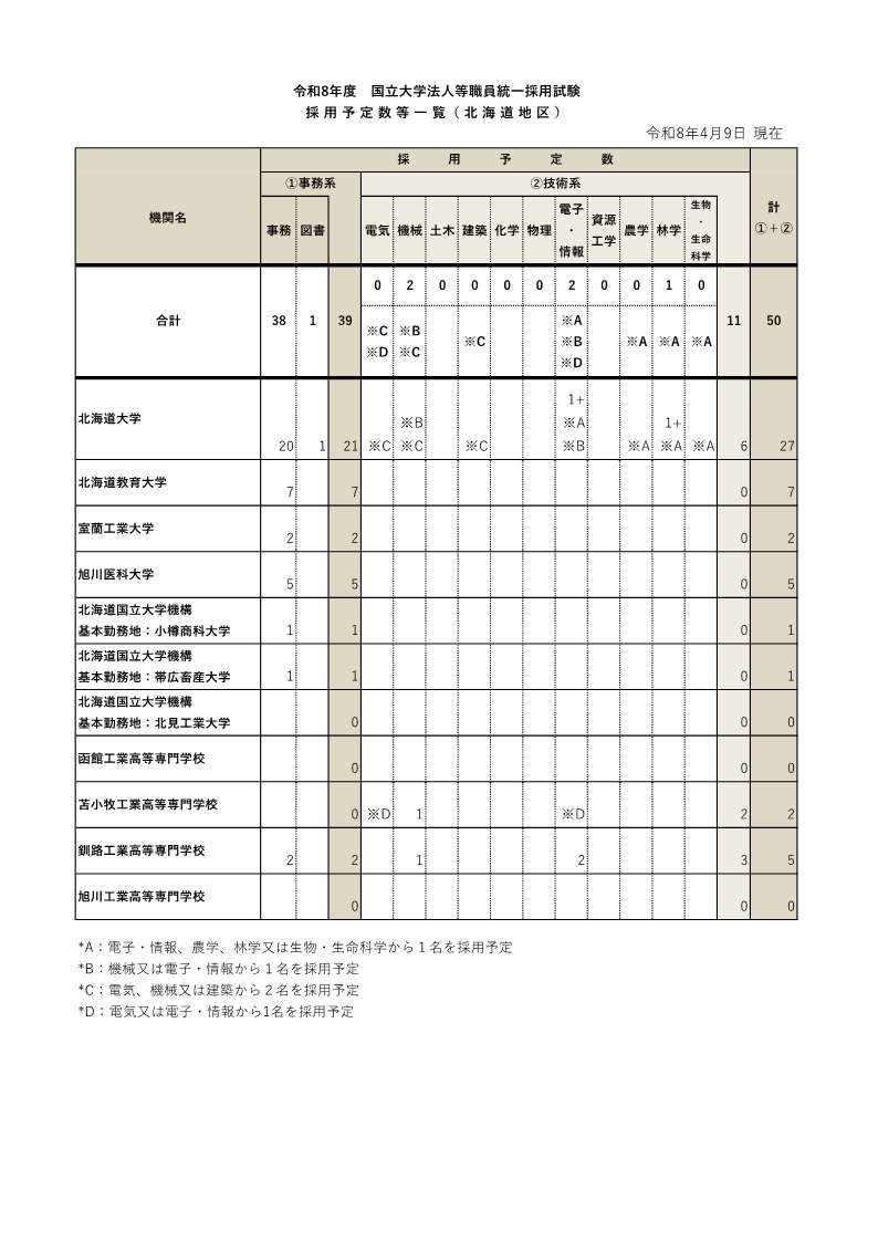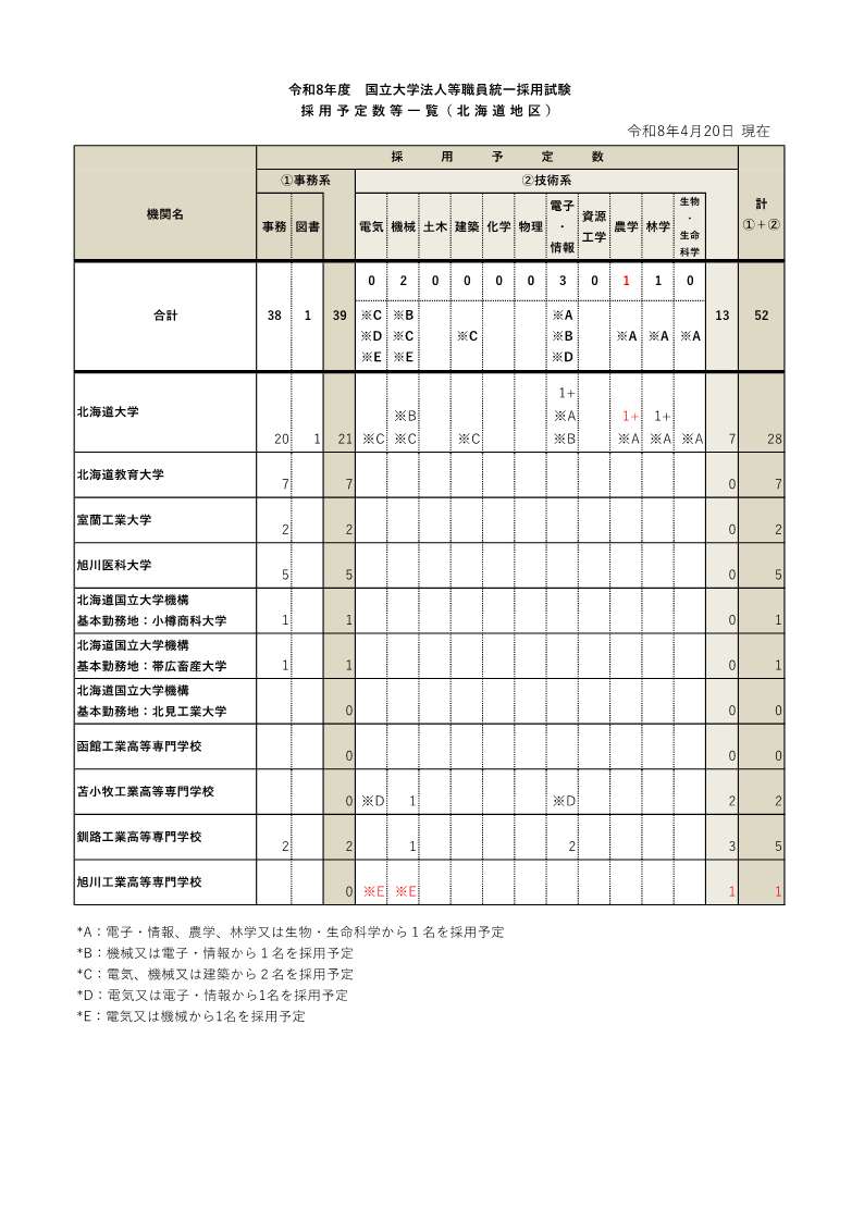 令和8年度北海道地区国立大学法人等職員統一採用試験における各国立大学法人等の採用予定数を掲載しています。採用予定数は、公表した時点での目安であり、各国立大学法人等の事情により変更する場合があります。採用予定数に変更があった場合には、随時、このページにてお知らせします。